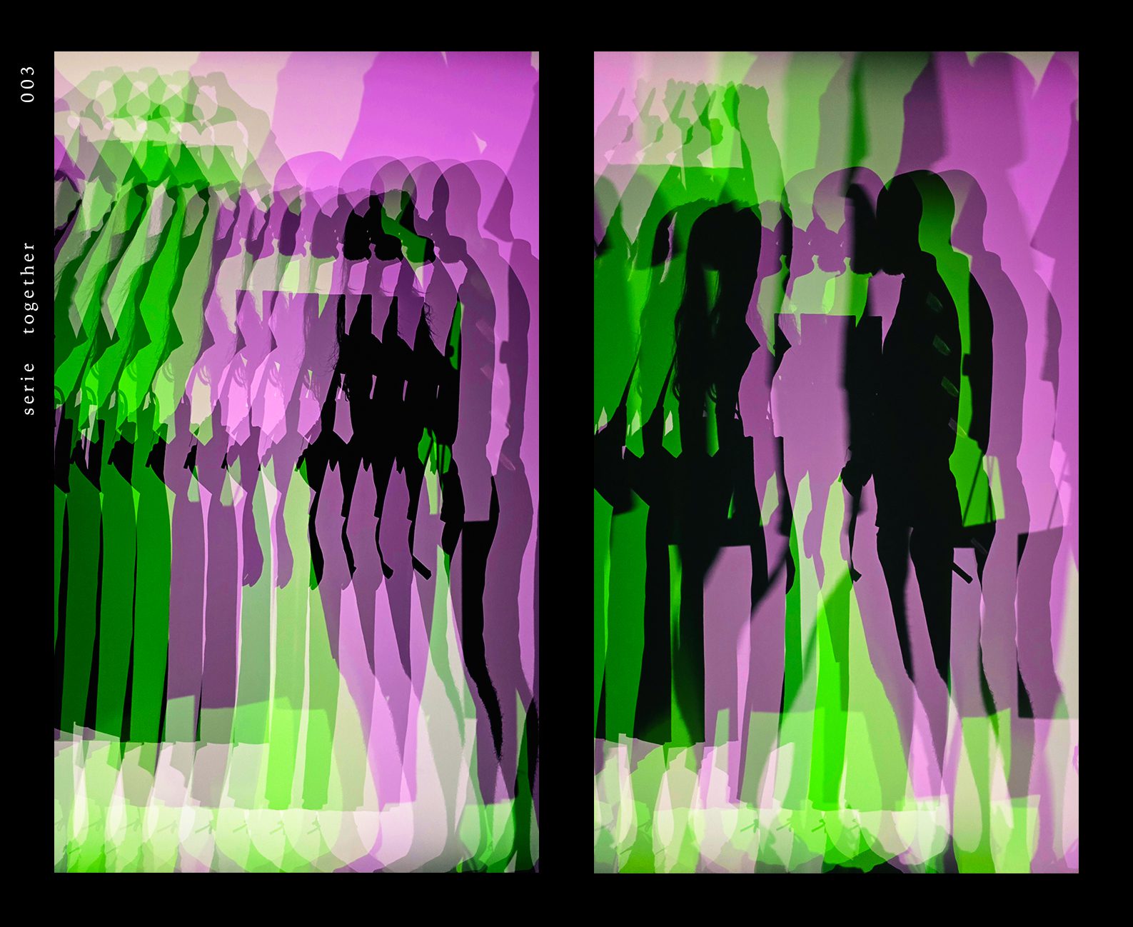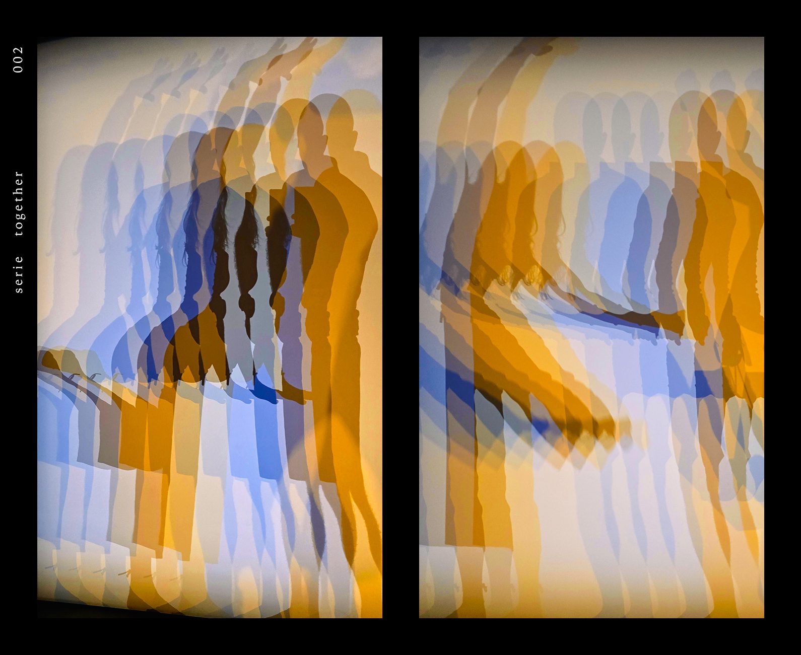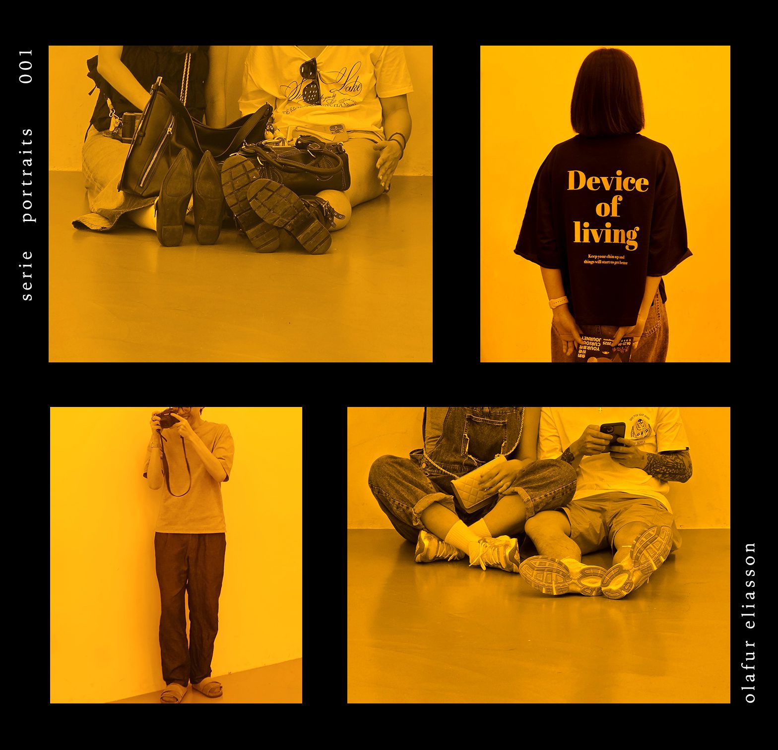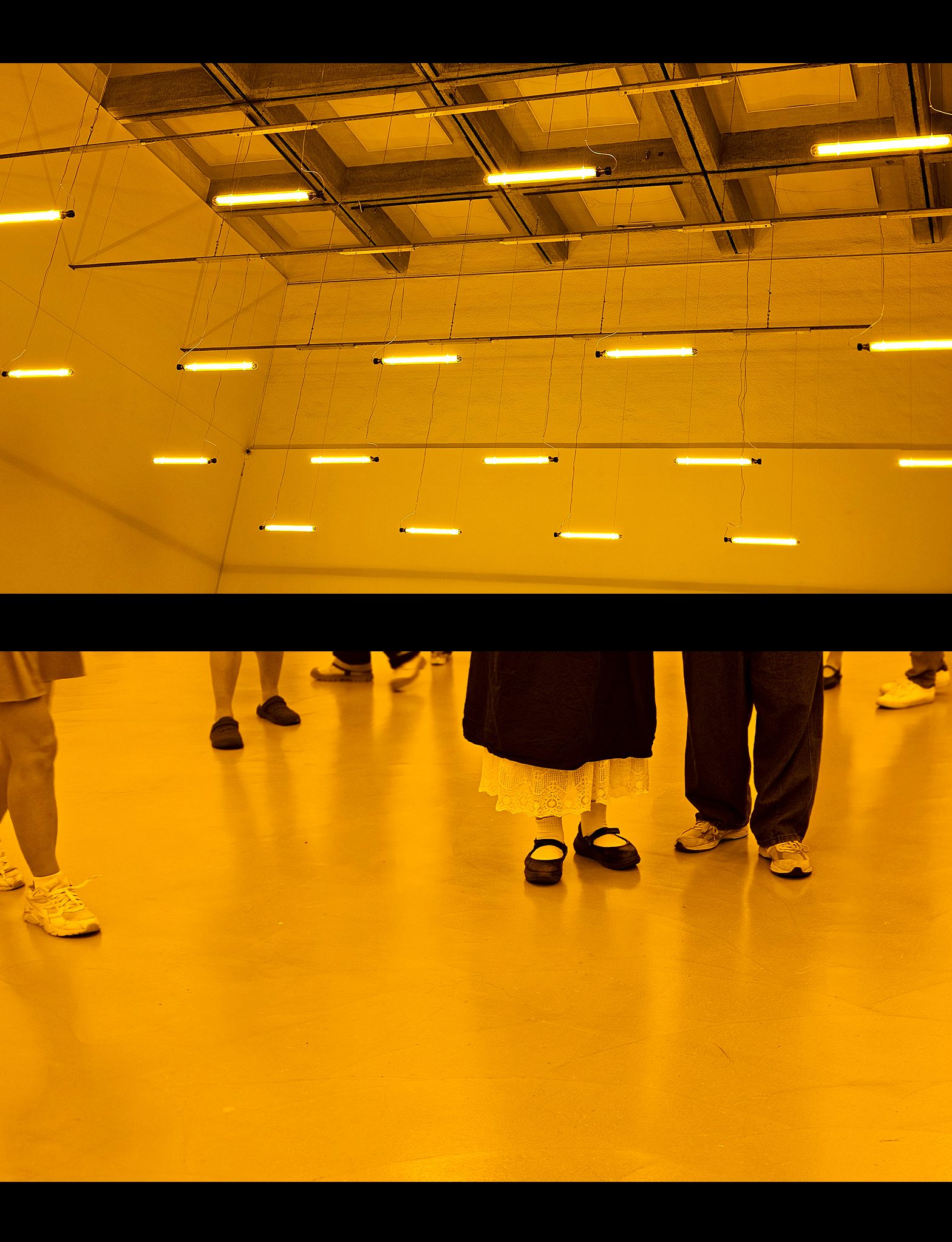 Under the effect of saturated yellow light, the scene loses its natural colors and is reduced to a vibrant monochrome. Bodies, clothes, and objects become silhouettes and textures, as if frozen in an old film.