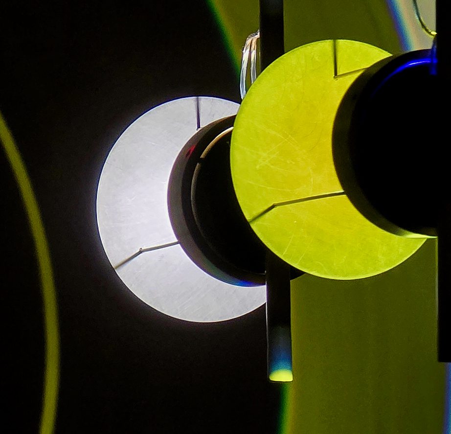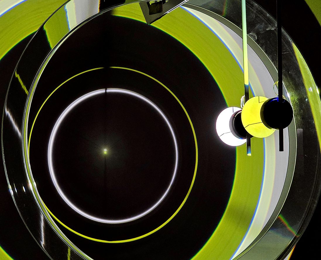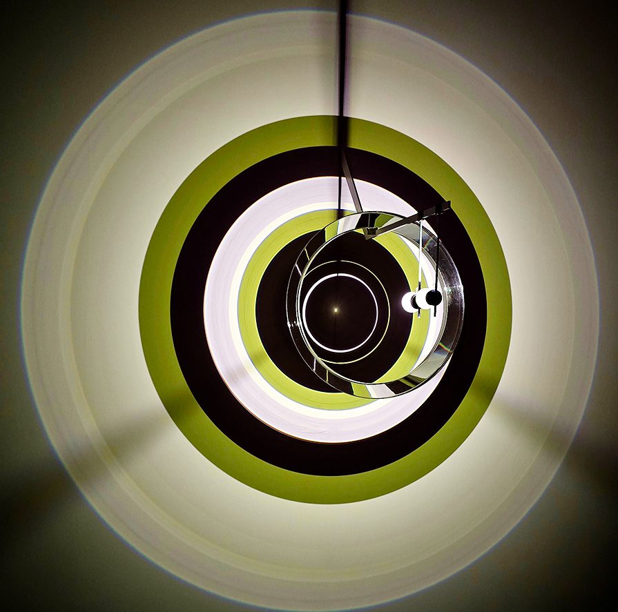Two superimposed light bulbs cast a series of luminous circles on the wall, like waves responding to each other. Light becomes matter, playing with space and the gaze, creating a hypnotic spiral on the wall. The gaze is drawn to a mysterious centre, between cosmos and introspection, where light becomes language.