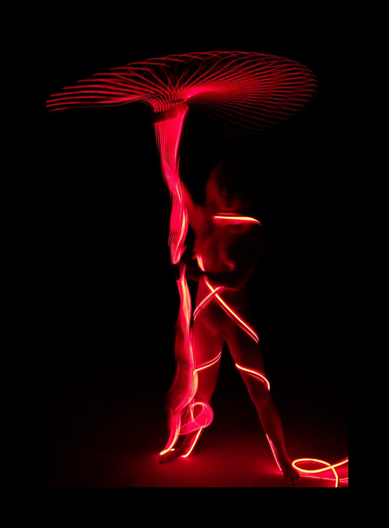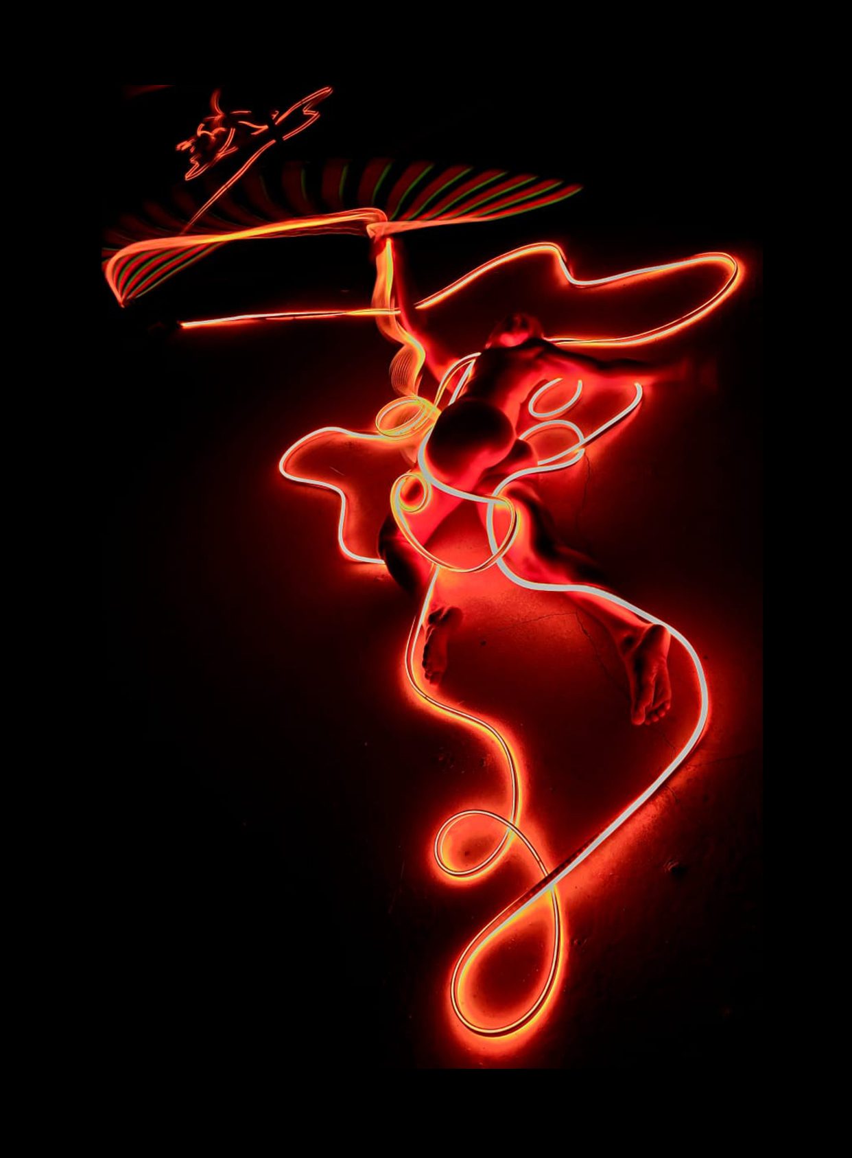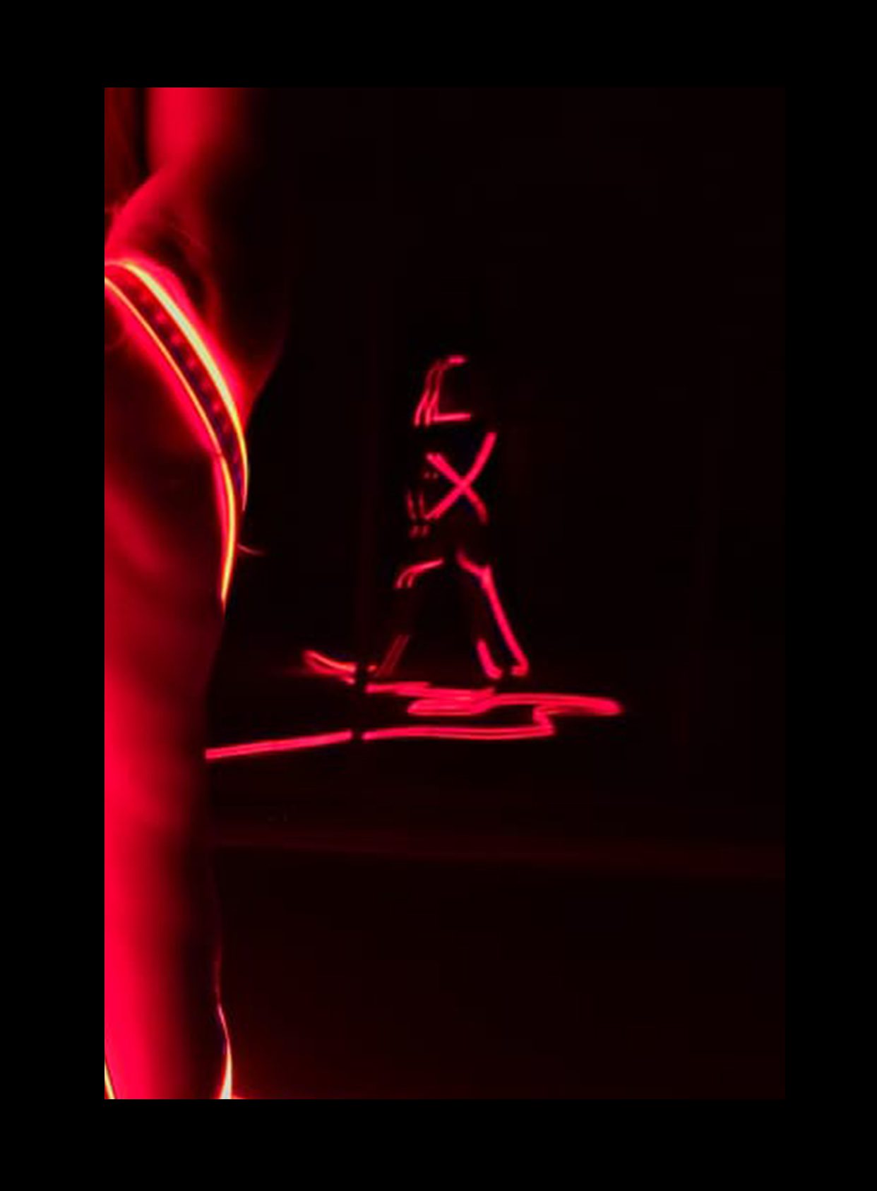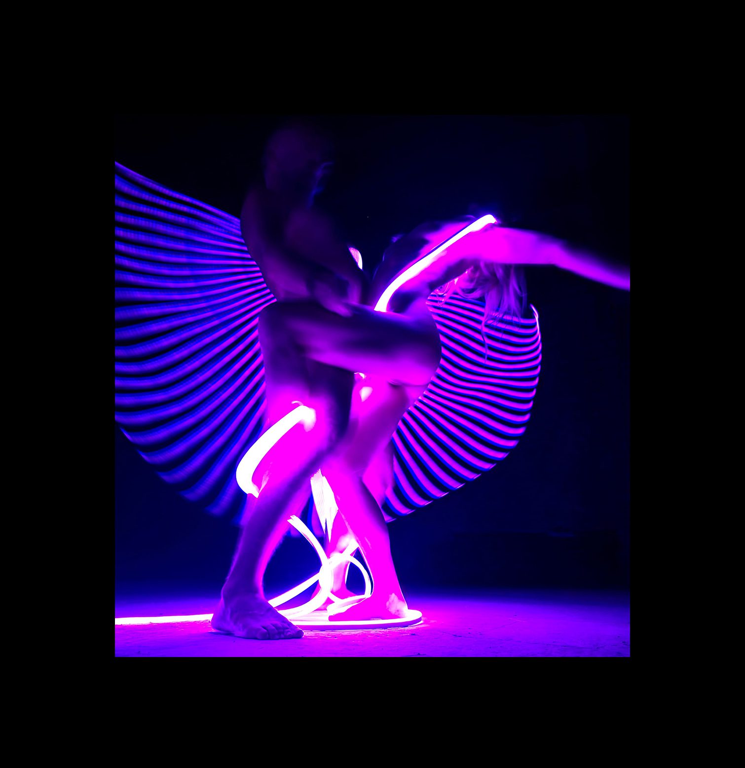 A warm summer evening discovering a forgotten box under the shelves… Inside, a long flexile neon wire. The terrasse in front of our house, a large empty space able to accommodate any of our creative ideas… Slow shutter speed trials and little by little strange digital captures emerging on the camera. Switching colors, mixing naked bodies, remote controlling, trying, testing, failing and retrying.