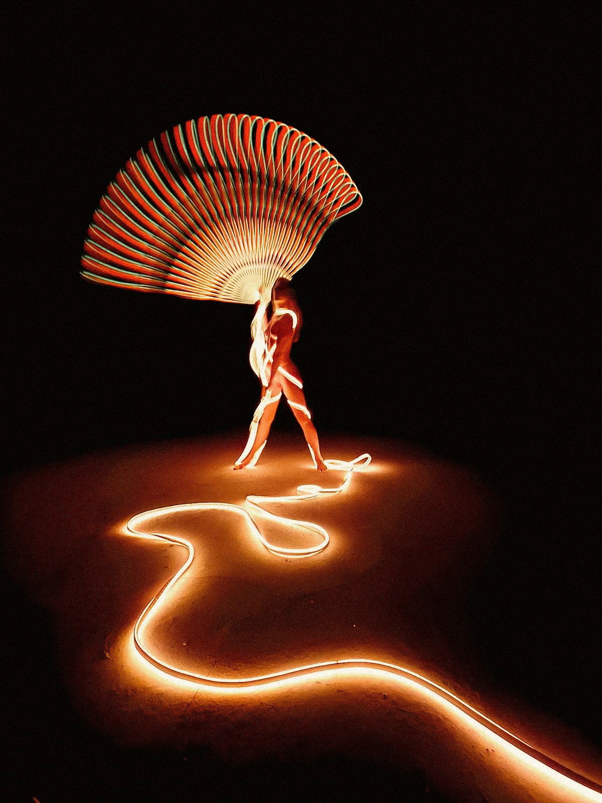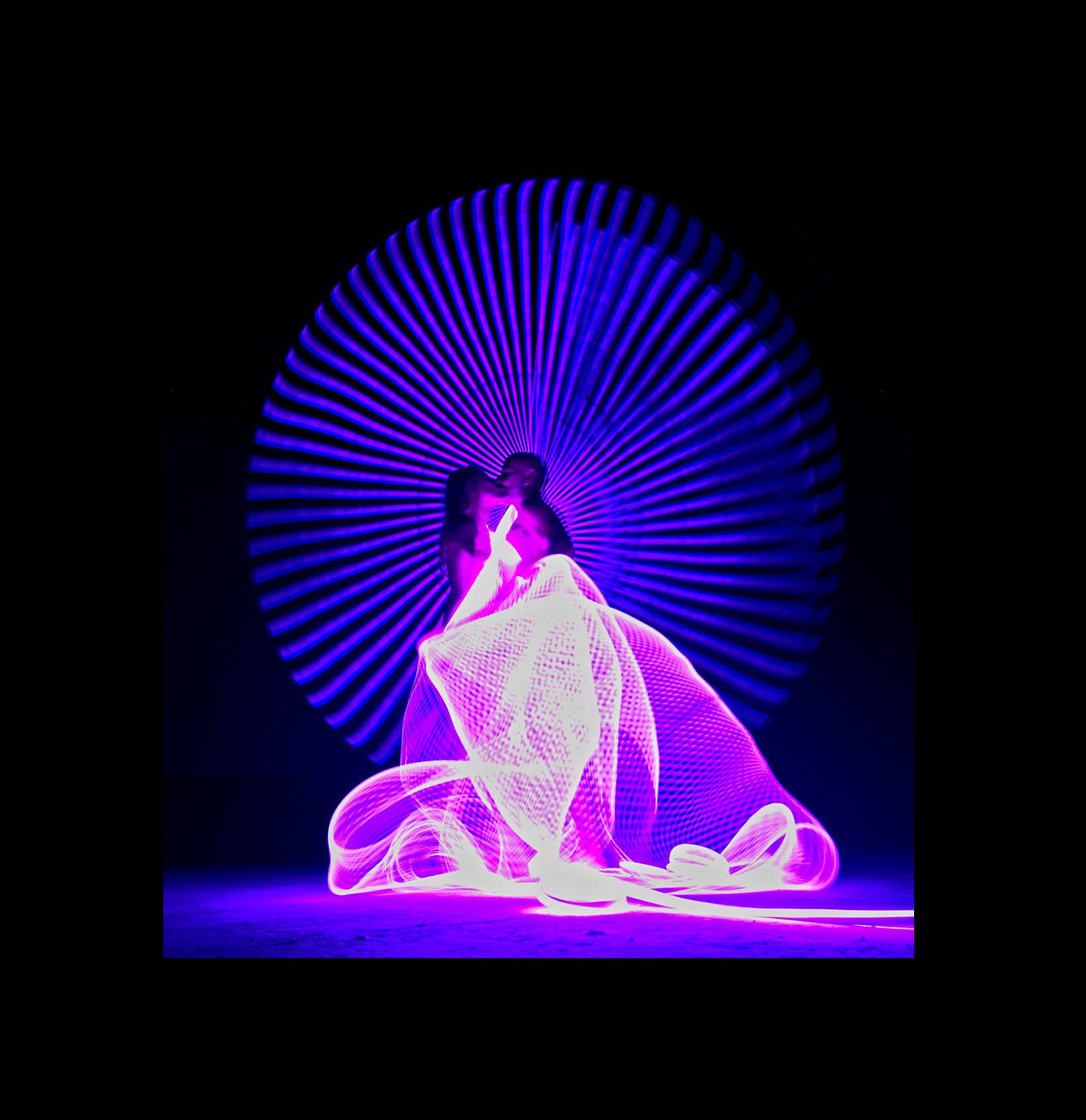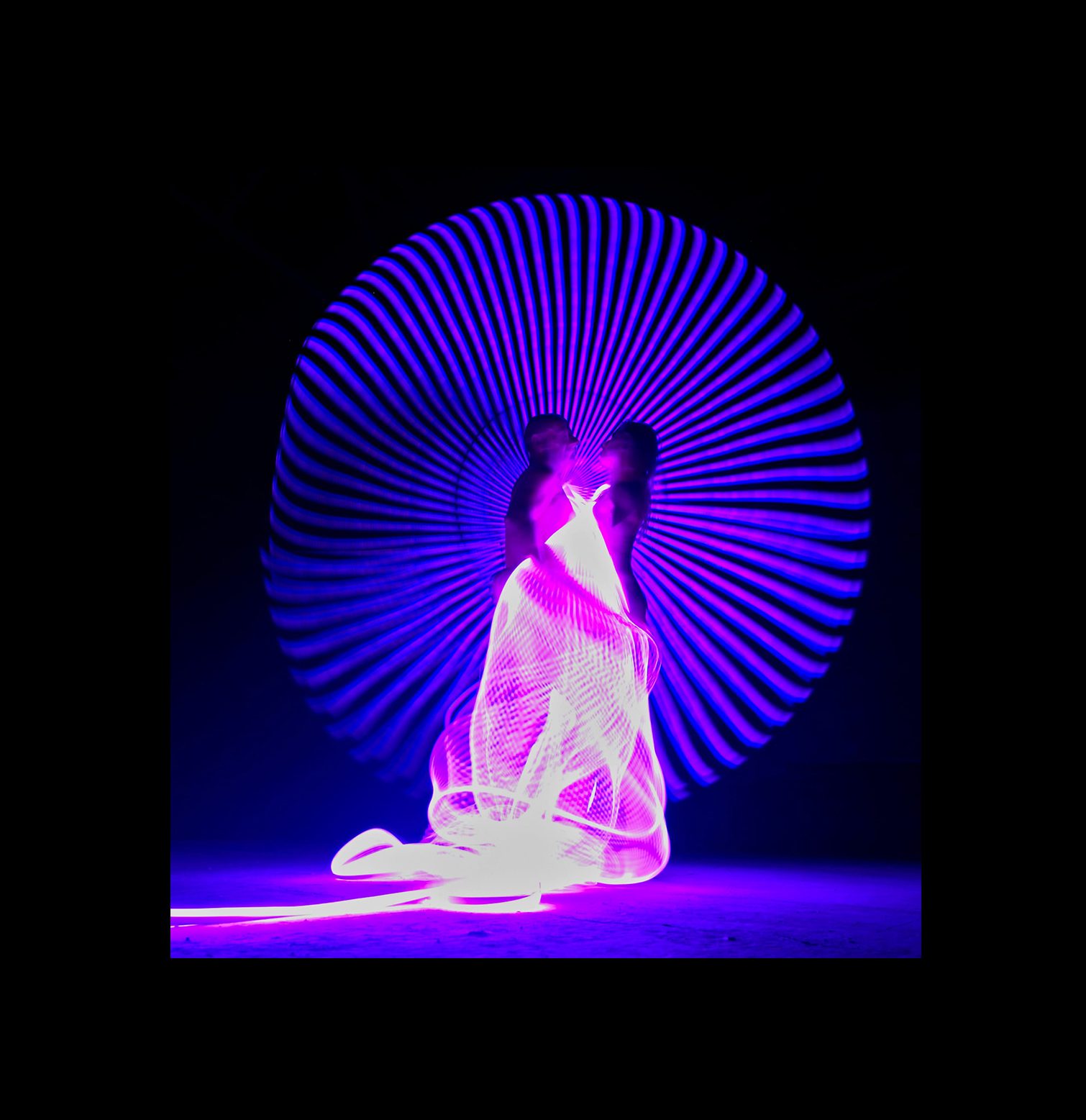 A warm summer evening discovering a forgotten box under the shelves… Inside, a long flexile neon wire. The terrasse in front of our house, a large empty space able to accommodate any of our creative ideas… Slow shutter speed trials and little by little strange digital captures emerging on the camera. Switching colors, mixing naked bodies, remote controlling, trying, testing, failing and retrying.