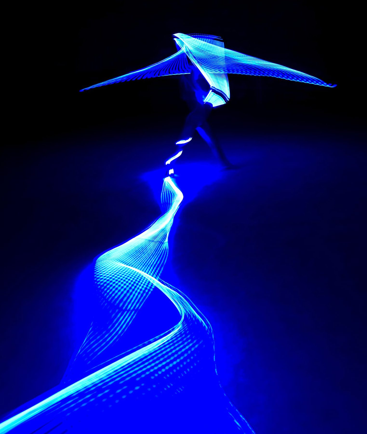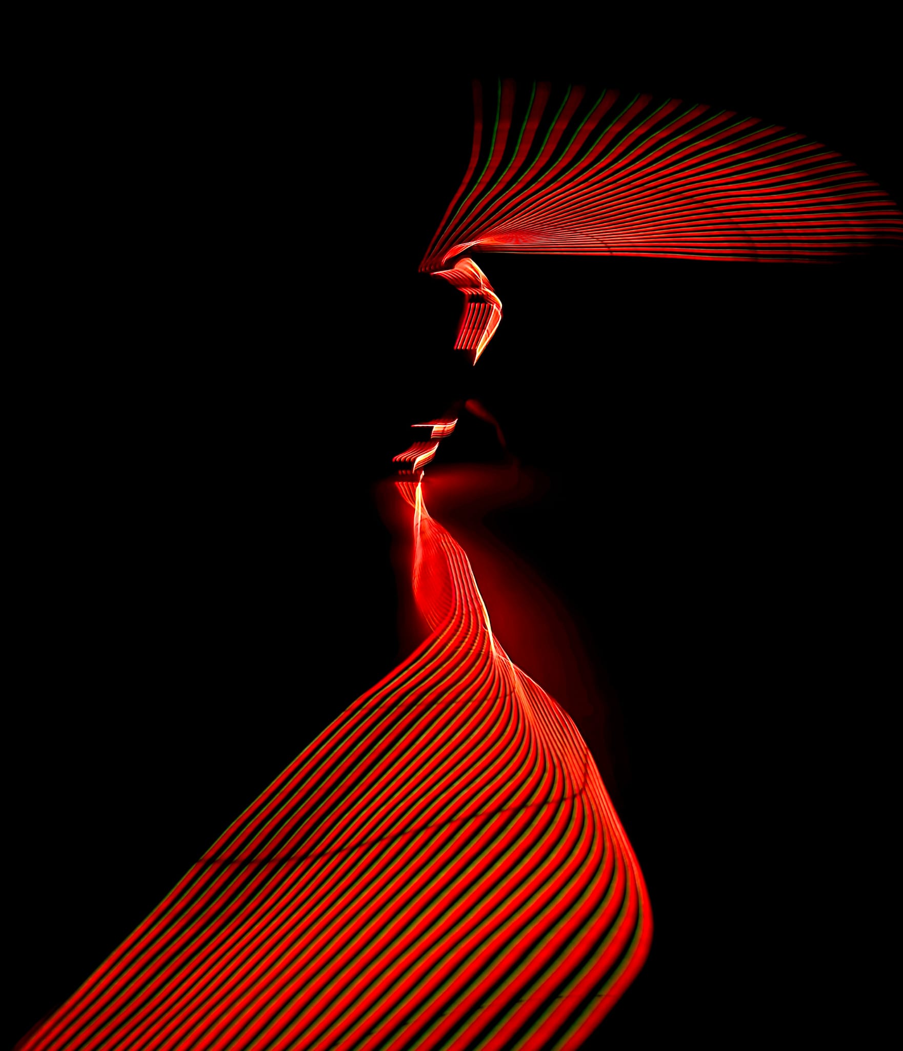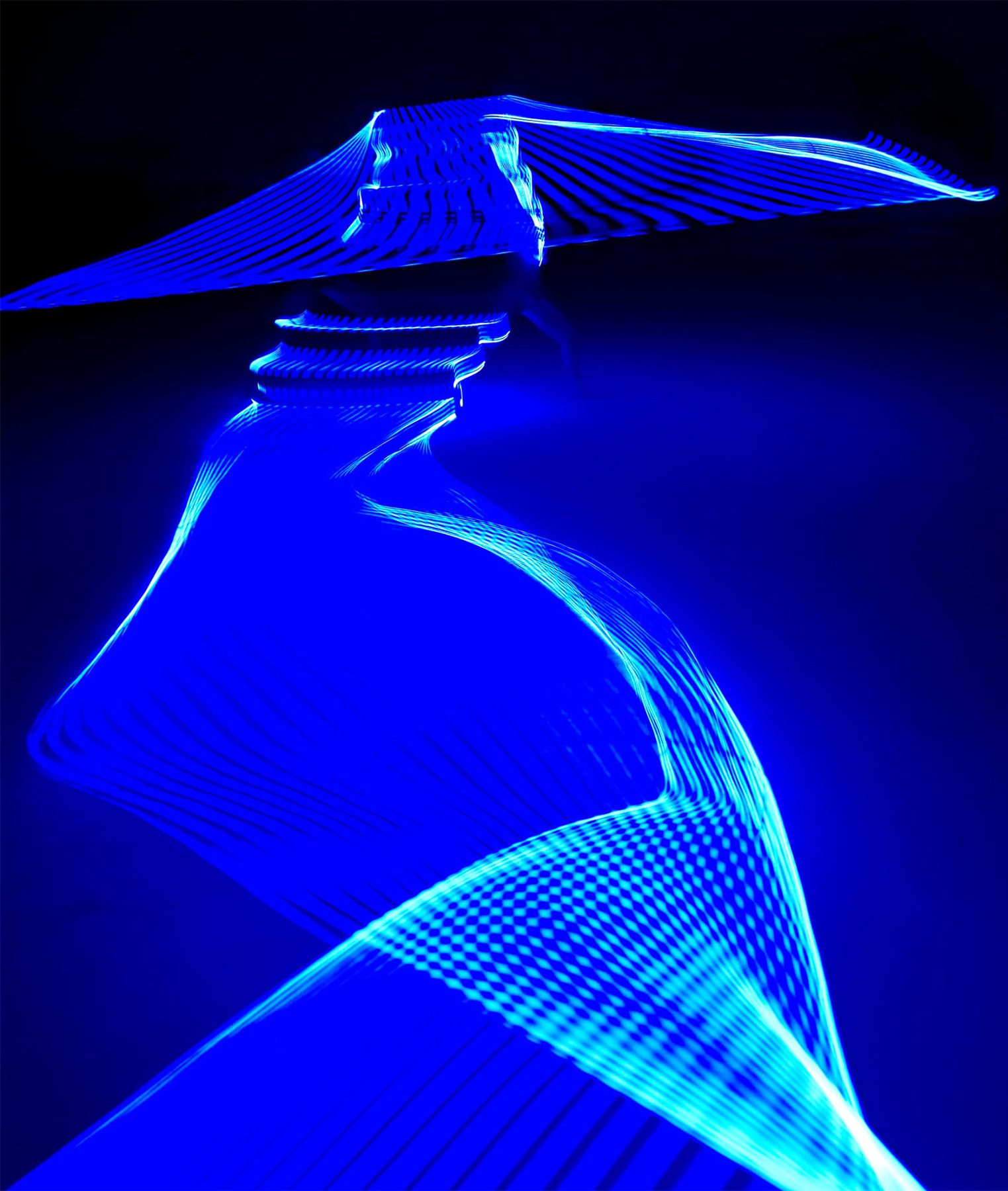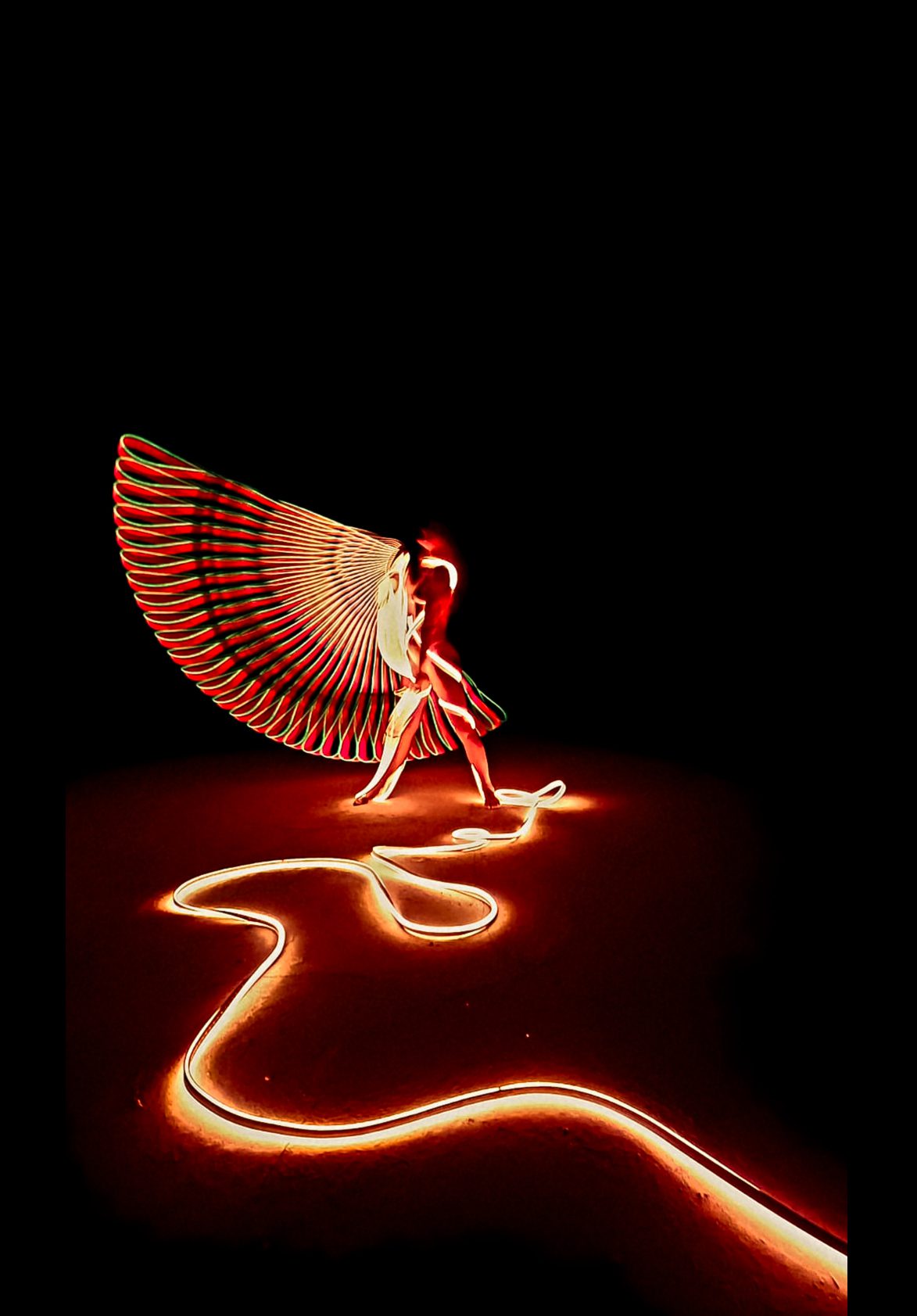 A warm summer evening discovering a forgotten box under the shelves… Inside, a long flexile neon wire. The terrasse in front of our house, a large empty space able to accommodate any of our creative ideas… Slow shutter speed trials and little by little strange digital captures emerging on the camera. Switching colors, mixing naked bodies, remote controlling, trying, testing, failing and retrying.