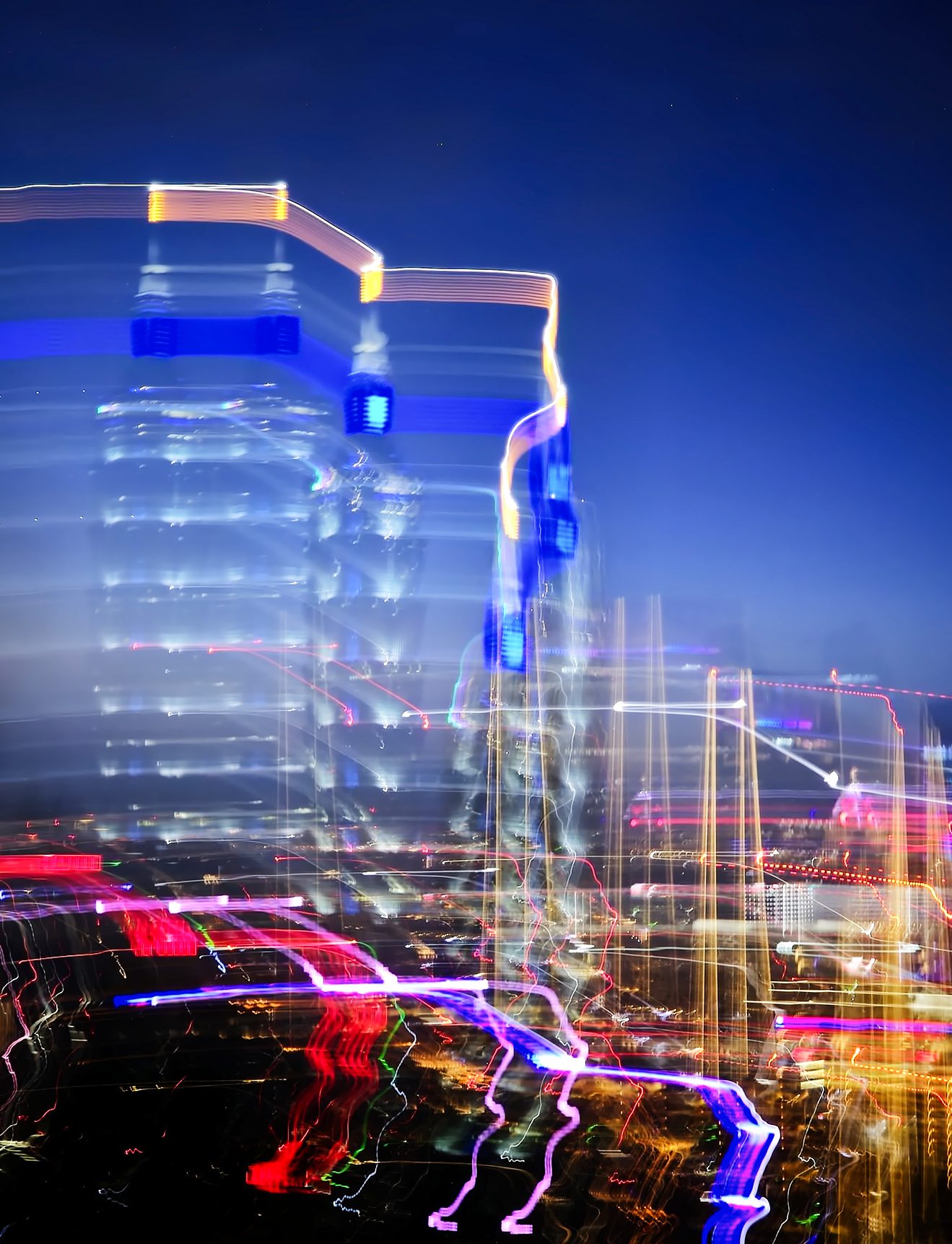 Here, the lens does not simply describe an urban reality: it transforms it into artistic material. The skyscrapers, extended into trails of light, become brushes tracing lines of fire on the nocturnal canvas.